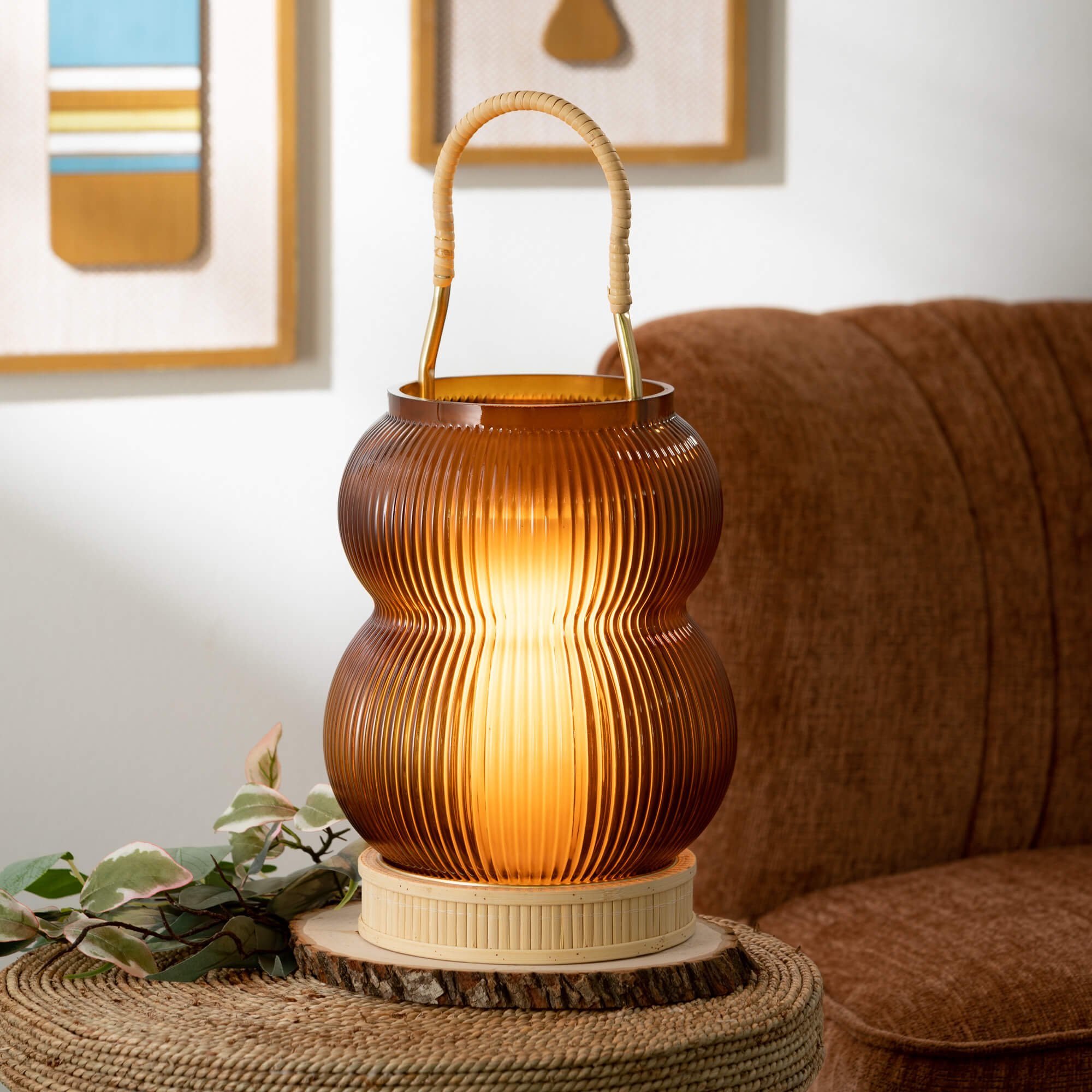Golden Ambiance: Illuminate your living room decor with the Amber Glass Lantern Set of 2, featuring a warm gold color that adds a touch of luxury to your home decor.